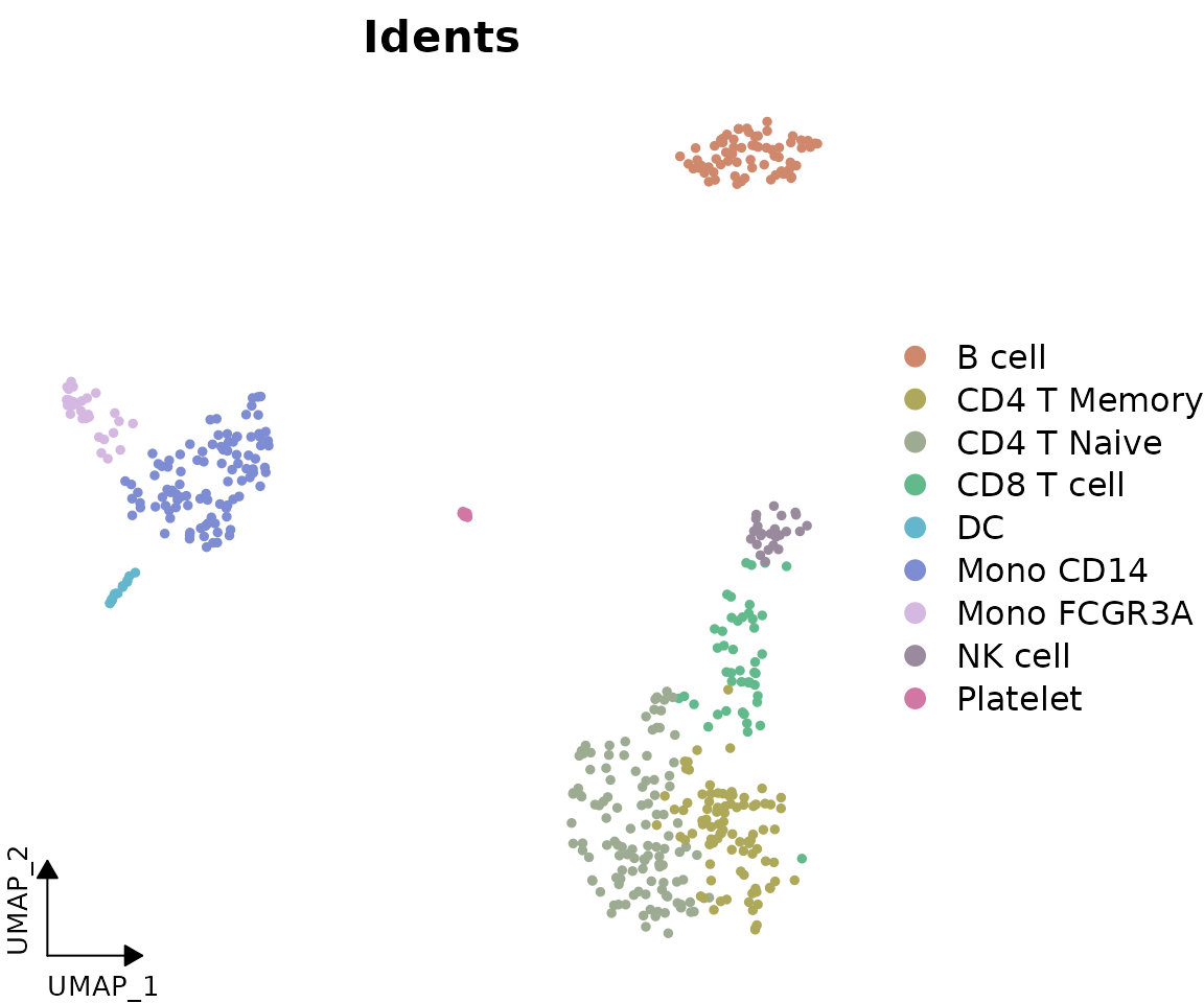 DimPlot2(pbmc, features = c("orig.ident", "cluster"), cols = "bright", ncol = 2, theme = NoAxes())